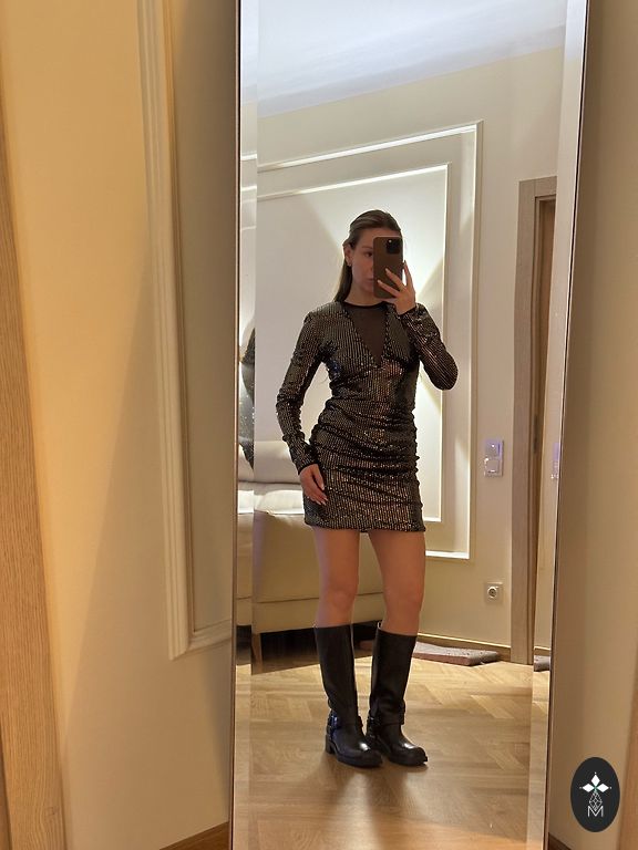 Siūlau įsigyti šventinę midi ilgio suknelę. Vidurinėje dalyje kokybiški apatiniai sijonai, rankų dalyje pusiau permatomas, laisvai krintantis audinys. Suknelė turi elegantiškų ir blizgių detalių, tokių kaip juostelės rankų ir juosmens dalyje. Nurodytas dydis 4XL, tačiau faktiškai tinka L dydžiui. *Ne Zara, prekės ženklas naudojamas dėmesio pritraukimui.