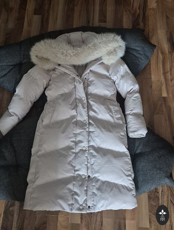 Plüüsvooder, väga soe. Mahlakas punane värv. Lõikega, mis teeb väga saledaks. Pikkus 108 kraest. Varrukas 68 kraest.