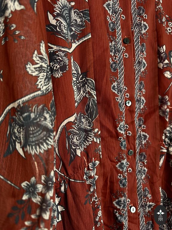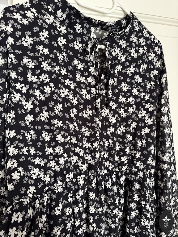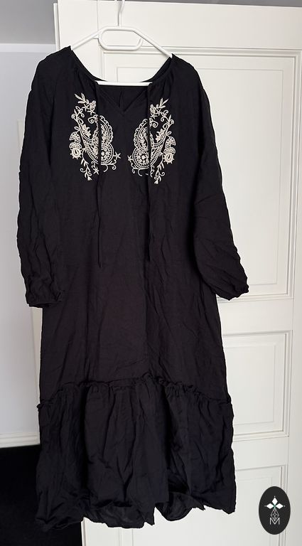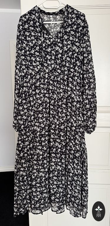 Ilus, vabalt langev, A-siluetiga volangkleit voodriga. Pealmine kangas on veidi läbipaistev väikeste pallikestega, all õhuke vooder. Õlgosa ja varrukad ilma voodrita. Ilus, elegantne, varjab kõik üleliigse. Rinnaümbermõõt 118, pikkus 135 cm.