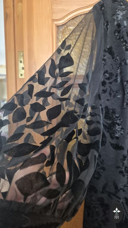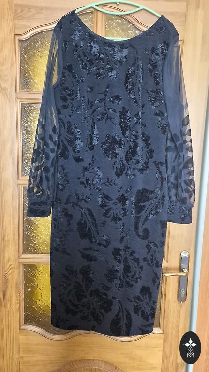 Müün kaunist kleiti erksasinises toonis läbipaistvate lillemustriliste varrukatega. Külgedel taskud, sidumisvöö. Materjal on hea, 5% elastaaniga. Tagaosa tõmblukk ja väike lõhik. Puudus on näidatud pildil - tagaküljel varrukatel heledad niidijooned. Pikkus 113 cm, rinna all 116 cm, talje 100 cm, puusad 116 cm. Saatmise kulud tasub ostja.