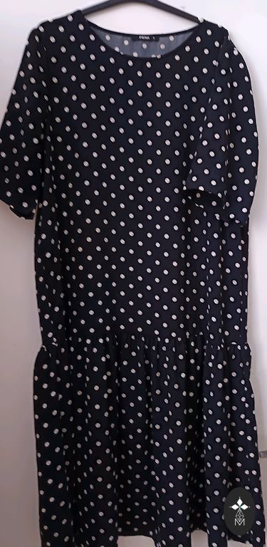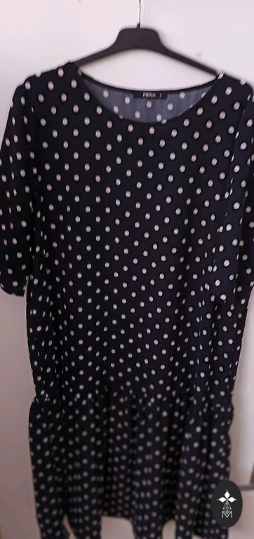 Krūtinė 128 cm, ilgis 115 cm, gražus sutraukimas prie kaklo, rankų galuose guma, medžiaga elastinga, nėra plona, krintanti.