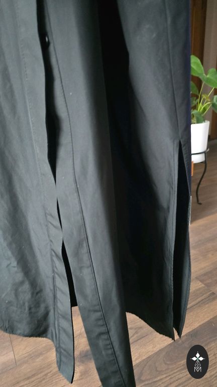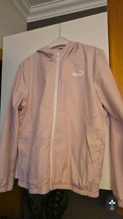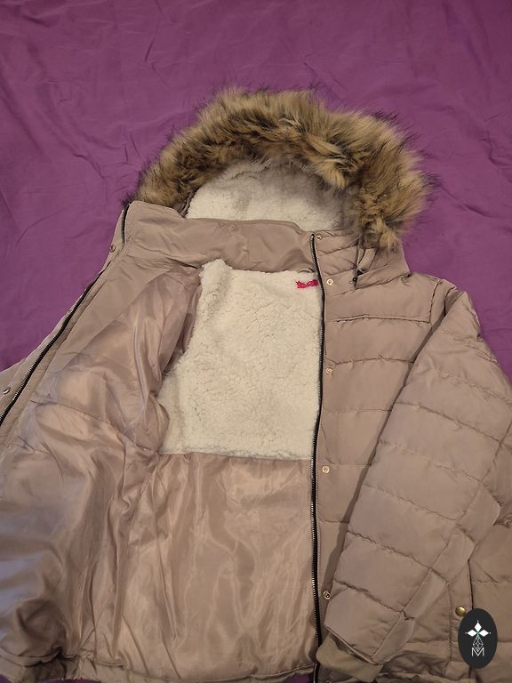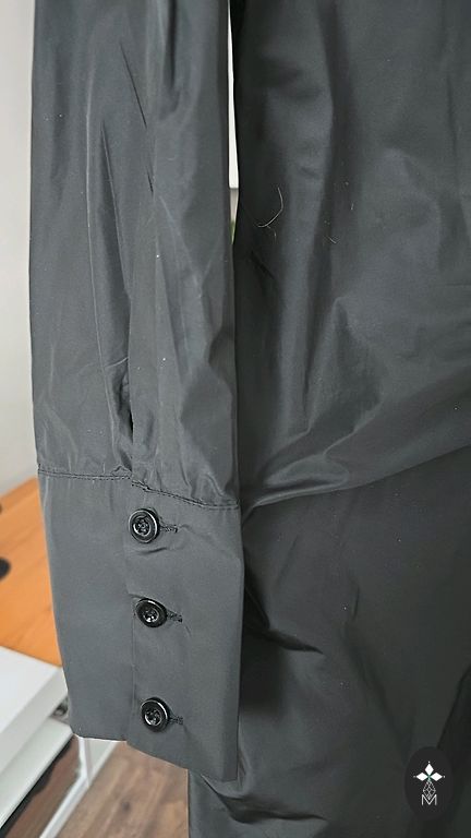 Black crinkled fabric bomber jacket with a hood. Suitable for size L-XL. It has pockets and a hood. Lined inside.