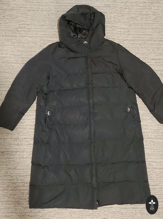 Suurus on märgitud 4XL, RU 54, koos Du Pont Sorona "bio udusulgedega". See materjal imiteerib looduslikke omadusi, samuti on see hüpoallergeenne, niiskuskindel ja hingav. Pikkus 94 cm, puusad - 122 cm. Naturaalne karusnahk - rebane. Ostuhind on lisatud.