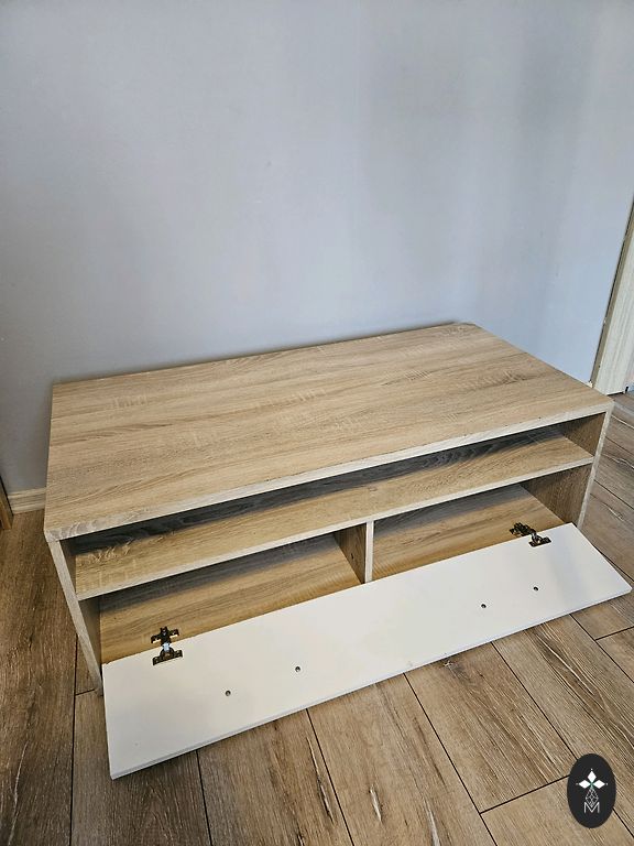 Teleriiul. Kaks pikka riiulit. Metalljalad. Pikkus 150 cm. Laius 58 cm. Kõrgus 40 cm.