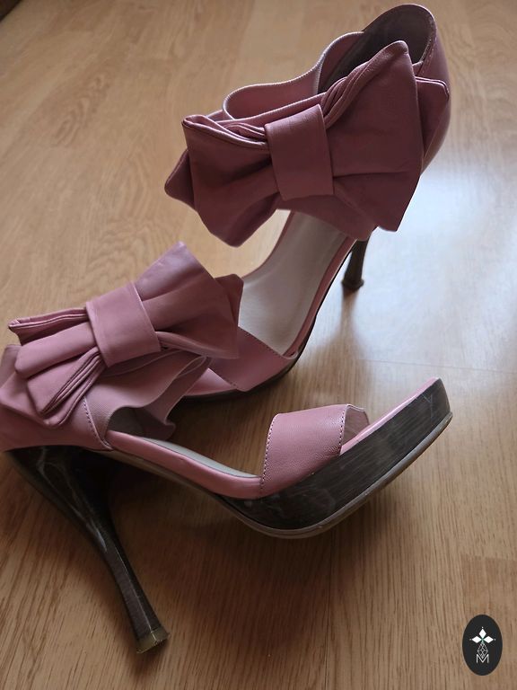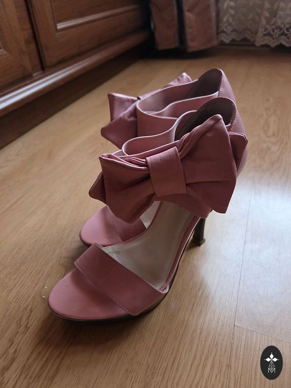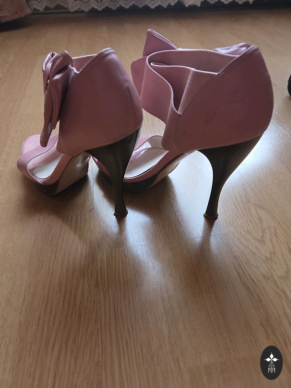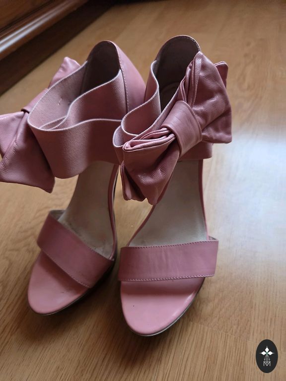 Kaunid nahast kingad kuldse ninaosa viimistluse ja roosa rihmaga kontsaga. Kontsa kõrgus 8 cm.