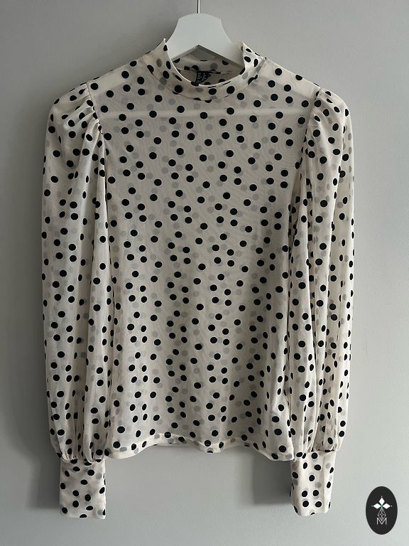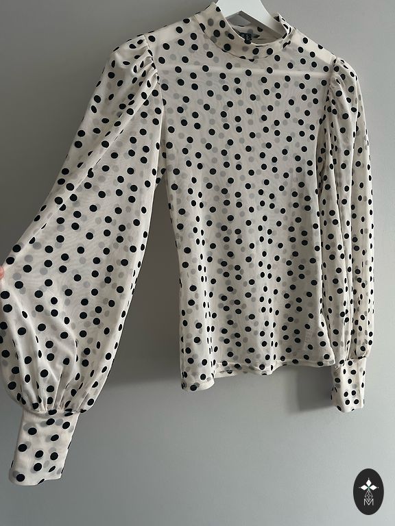 Pleasant, silky blouse with a bunny print. Size 34 indicated. Suitable for xs, s size. Chest-90cm, sleeves-74cm, bottom edge-96cm, blouse length-62cm. Sleeve width 30 cm. The sleeve ends have elastic.