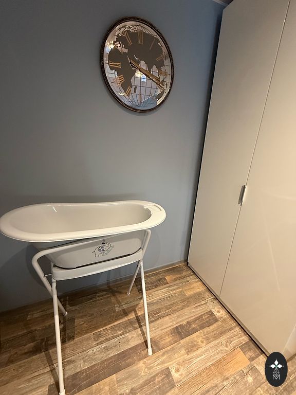 Puikus įrenginys, kuris mums tarnavo metus ir aštuonis mėnesius nuo vaiko gimimo. Viskas viename. Patogu plauti kūdikį ant paaukštinimo, kol dar amžius leidžia. Prižiūrėtas, švarus, nes naudojome vienkartinius paklotus paviršiui. Su daiktų saugykla po vonia/paviršiumi. Ant ratų su stabdžiais. Patogumui yra vamzdelis vandeniui nuleisti. Atrodo tvarkingai ir kambaryje, jei vonios kambaryje nėra vietos. Vienintelis dalykas, kurio nėra komplekte, yra 'dušo' indas. Parduodame surinktoje formoje. Reikia išardyti patiems, jei toks noras. Vyrui buvo gana sunku surinkti, todėl nerekomenduojame išardyti. :) Visą informaciją - susirašinėjime.