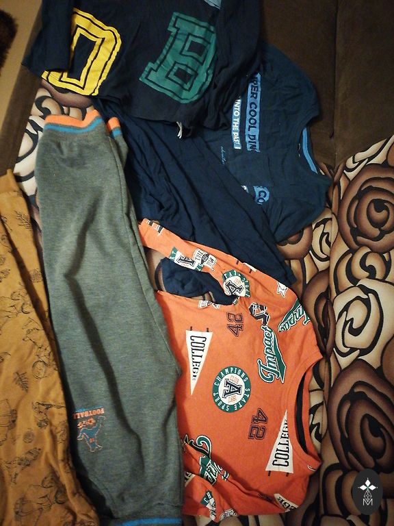 Skapja revīzija. NIKE, H&M, Joma, 4F u.c. krekliņi, šorti, bikses, džemperis un pidžamma. Zaļais NIKE krekliņš, gaišās treniņbikses, sarkanais Sinsy krekliņš— jauni, nav vilkti nemaz; 4F, H&M un Temu “traktora” krekliņi, džegingi un šorti (H&M, NIKE), piedžamma —ļoti labā stāvoklī; pārējie krekliņi un džemperis— labā stāvoklī. IZM. 152/158, bet džegingi 164.izm.