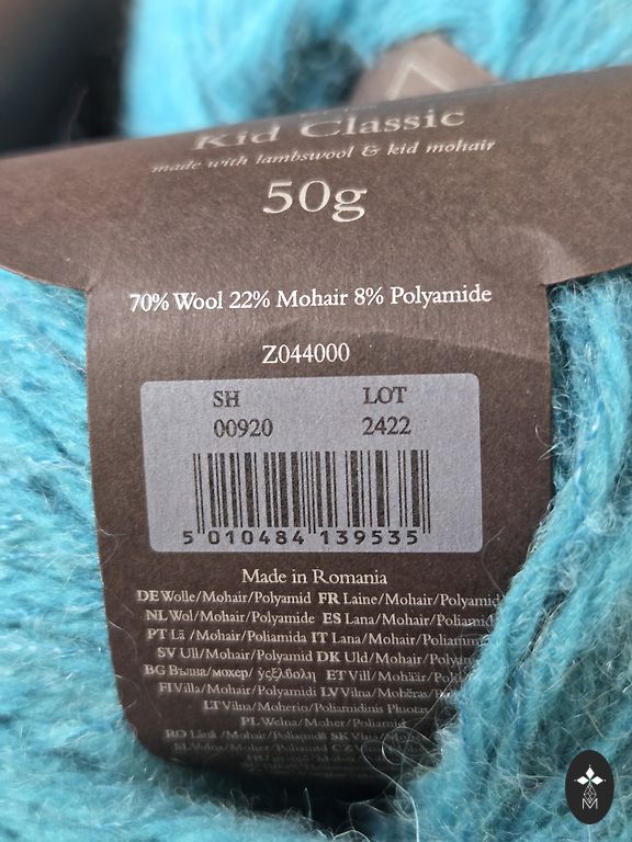 Кидмохер 30%, мериносовая шерсть 30%, полиамид 40% пряжа. Метраж примерно 500м/100г. Вес без катушки 110г.