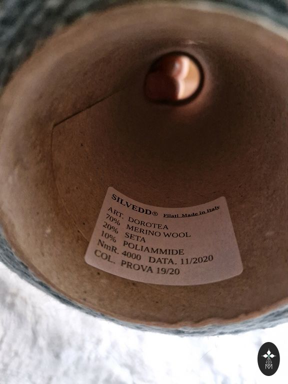 Graži, dangaus mėlynumo siūlai. Pirkta coolwool.lv, pagaminta Italijoje. Tikslios sudėties nepamenu, medvilnė ir šilkas. Labai minkšta. 10 sruogų, 500 g. Yra Grīziņkalne.