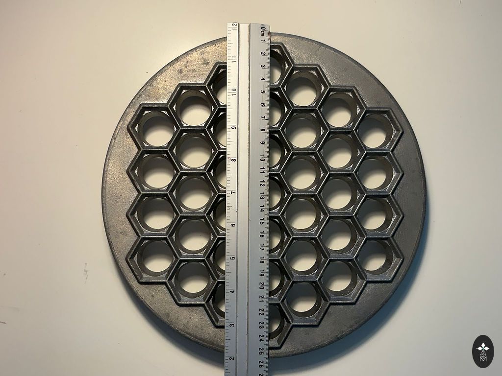 Izmēri: augstums 7 cm, diametrs 10,5 cm, apakšas iekšējais diametrs 7,5 cm, augšas iekšējais diametrs 8,5 cm.