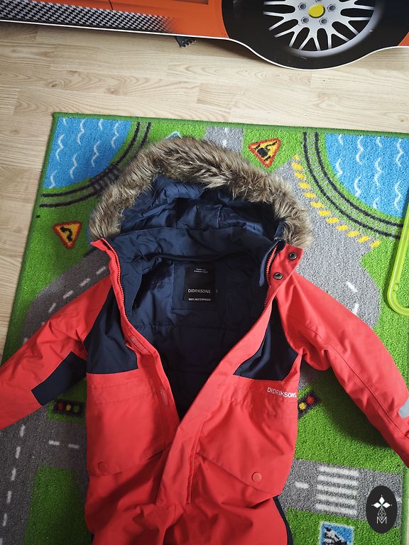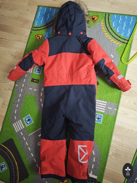 Didriksons Galon insulated pants, repel moisture, are rubber, with extra warmth for the back with a fleece jacket, fasten with hook-and-loop, rubber at the ends. Bright, noticeable, in good condition, not torn anywhere, size 130. DPD additional 2 EUR.