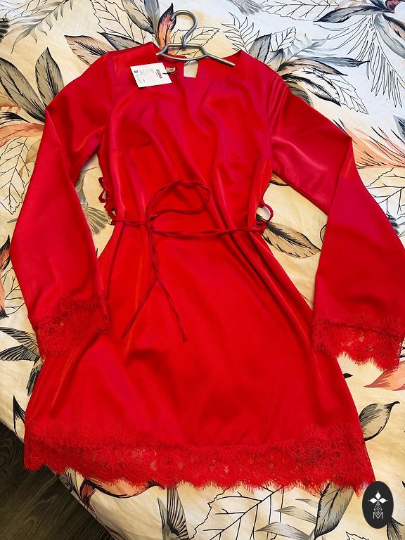 Новое красивое платье на размер S, с поясом и кружевами. Omniva включена в цену.