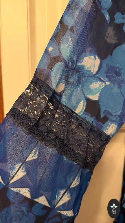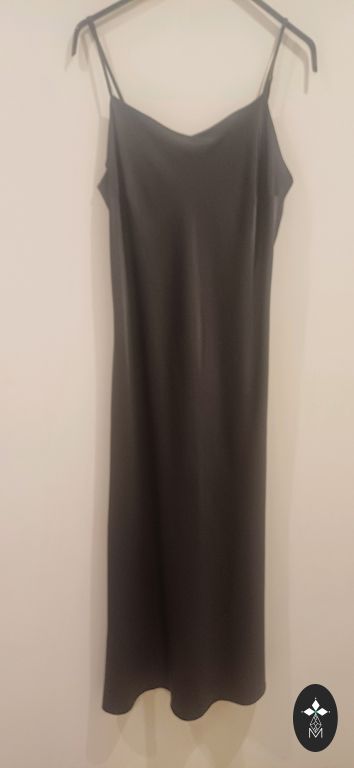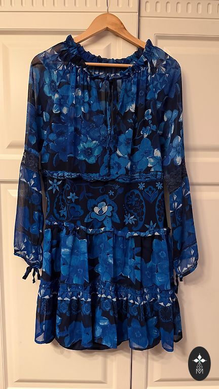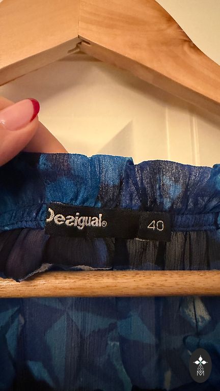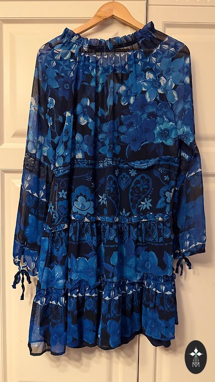 Two-piece dress - underdress and overdress. Light blue. Size 14 is written, not sure which to actually use, because the underdress is wide, the overdress will fit S as well, it is very stretchy. Elastic in the waist, skirt is fuller. I wore this on M, I like when the underdress is wide, it fit very well and looked good. Very cute sleeves. Can be worn separately as well. The underdress measures around 46 under the arms (stretchy), length without straps about 70. Both parts do not wrinkle. Tie at the neck.
