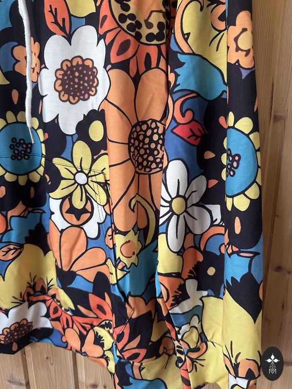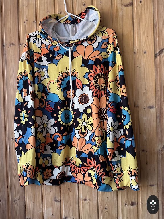 Nesiglamus, lengvas elastano medžiaga. Priekyje ir aplink rankoves yra gražūs deimantai. Priekis suapvalintas, galas tiesus. Krūtinės srityje 70x2 cm, priekio ilgis 87 cm, galas 94 cm. Rankovė nuo apykaklės 62 cm. Ilgesnių rankų savininkėms gražiai atrodys, nes gražios yra megztinio rankovės.