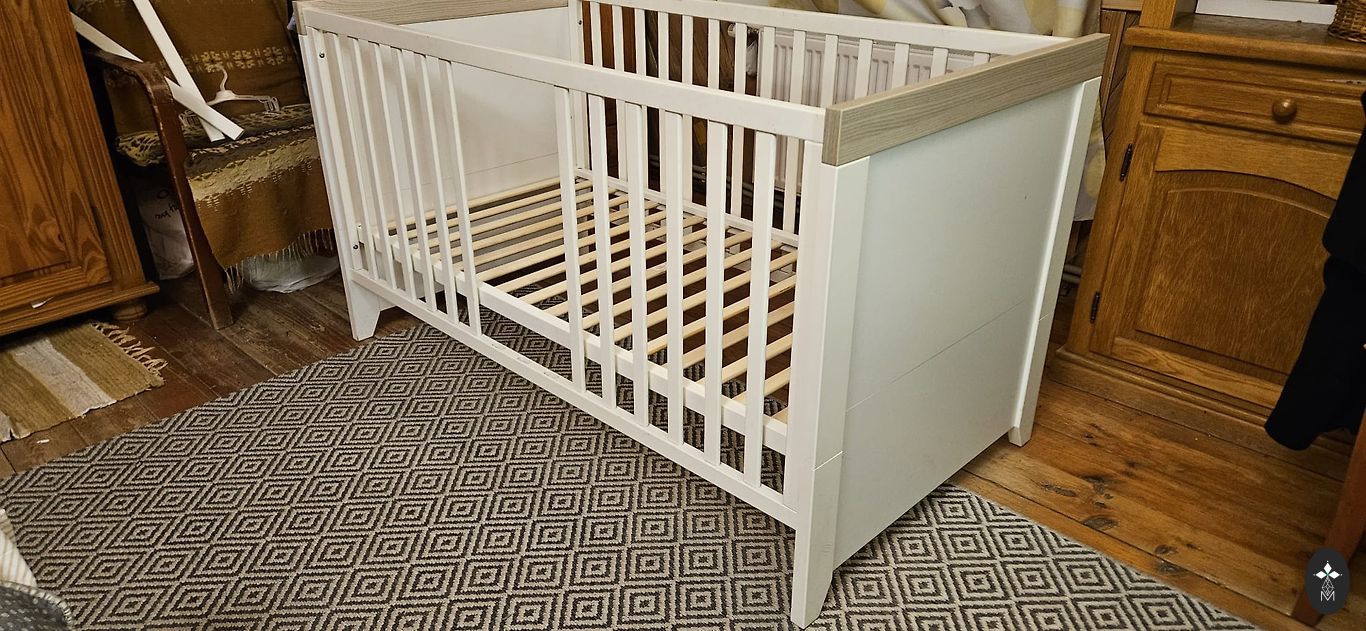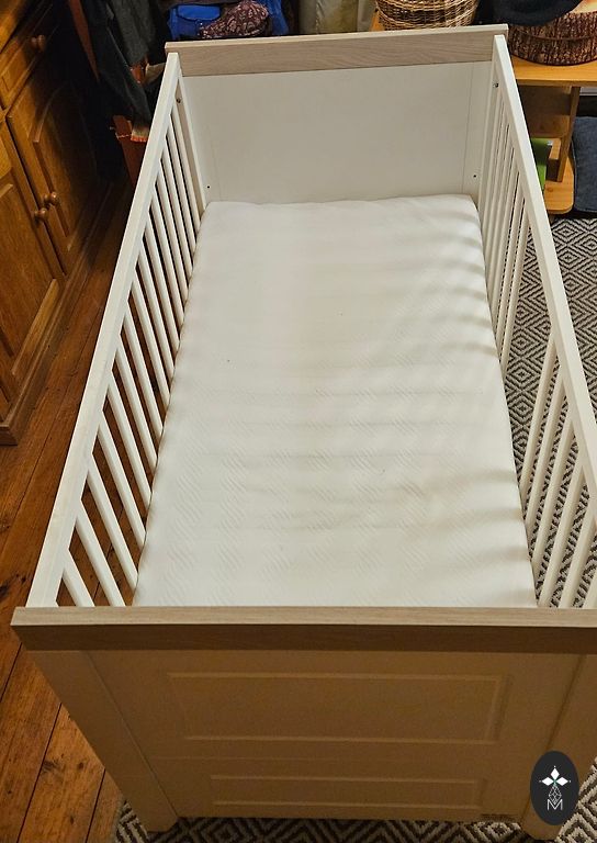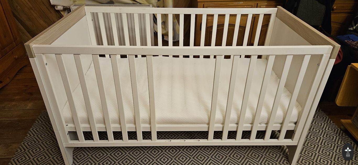 Parduodu vaikišką lovytę kartu su čiužiniu. Ant čiužinio naudotas vandeniui atsparus paklotas. Matmenys: 60*120 cm.
