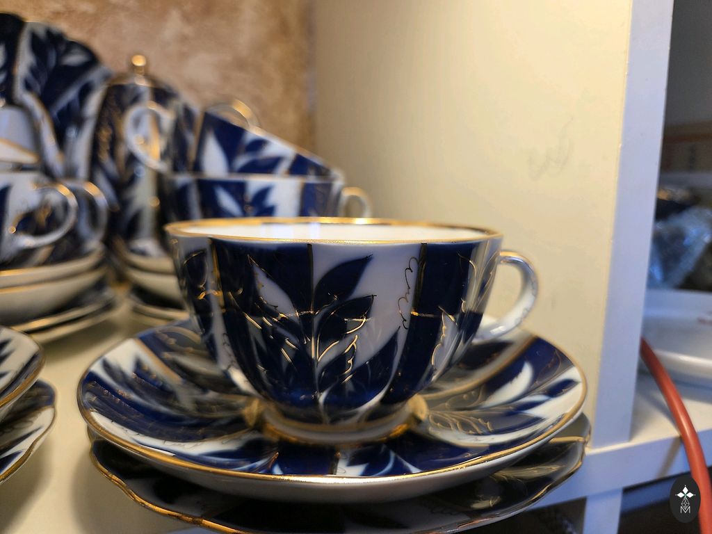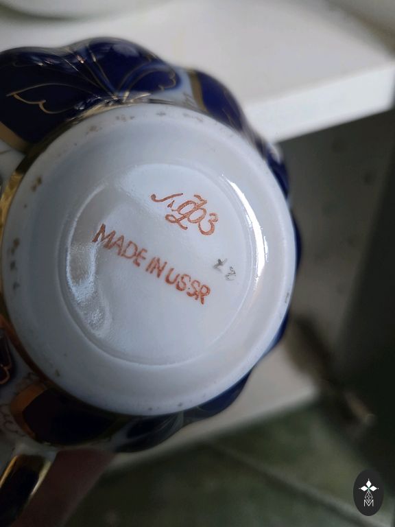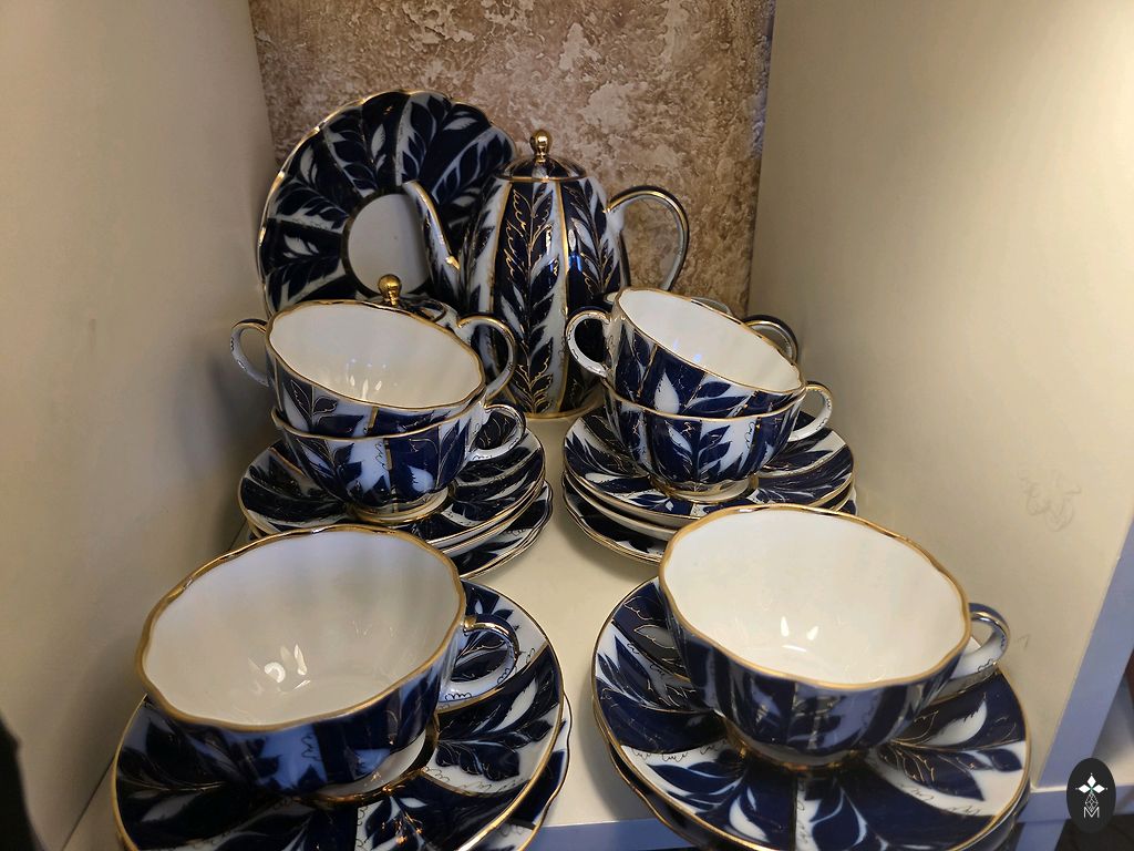 Lielisks priekšmets kolekcionāriem (PSRS porcelāns, kobalts+zelts, retro dekors) vai lietošanai. Zelts spīdīgs, minimāls nodilums.