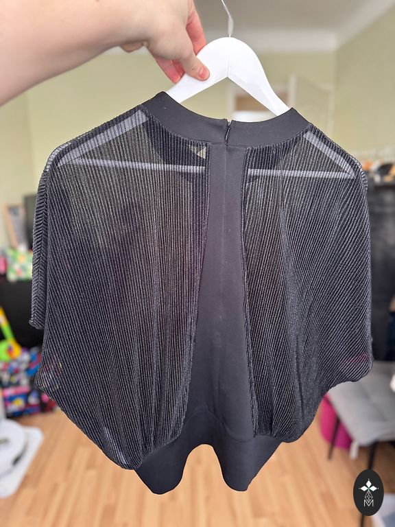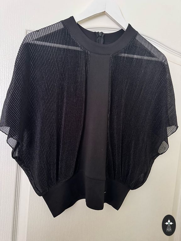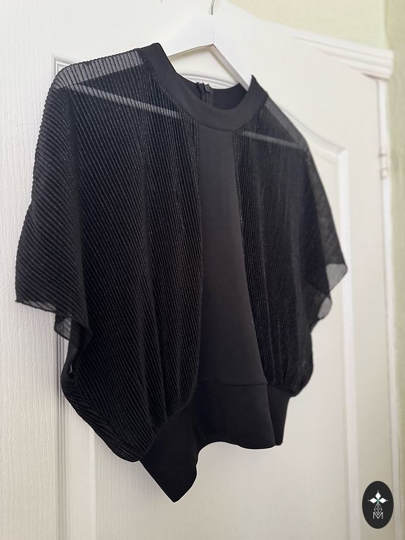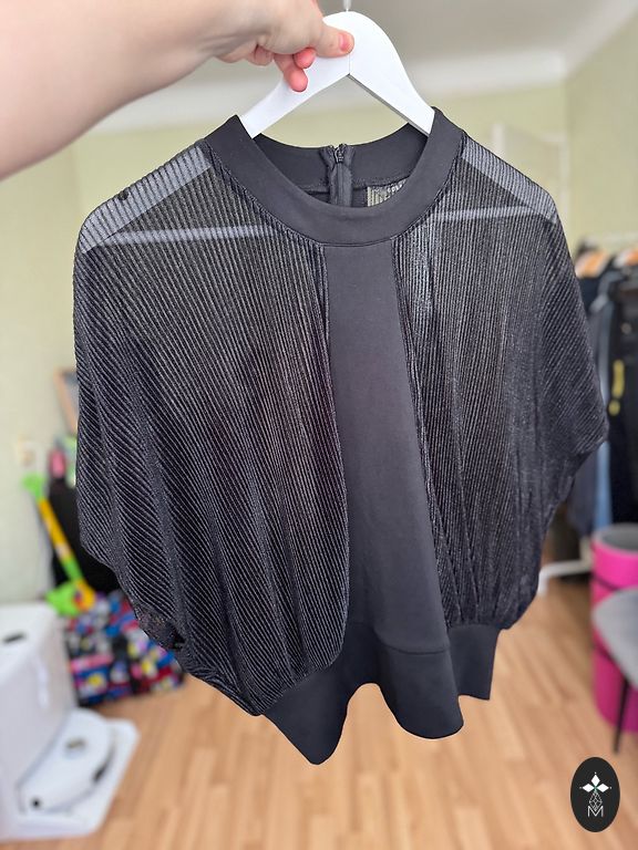 Itališka gipūrinė palaidinė-marškiniai su auksine furnitūra ir aplikacija ant nugaros. Gipūras su elastanu. Naujos prekės būklė. Nugaros ilgis - 57 cm; krūtinės apimtis - 45 cm; rankovės ilgis nuo peties - 67 cm.
