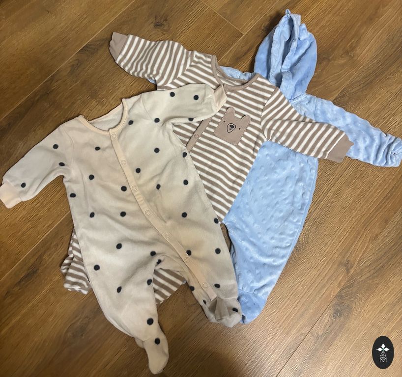 Trys žieminiai kombinezonai. Premija - kūdikio miegmaišis.