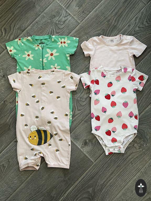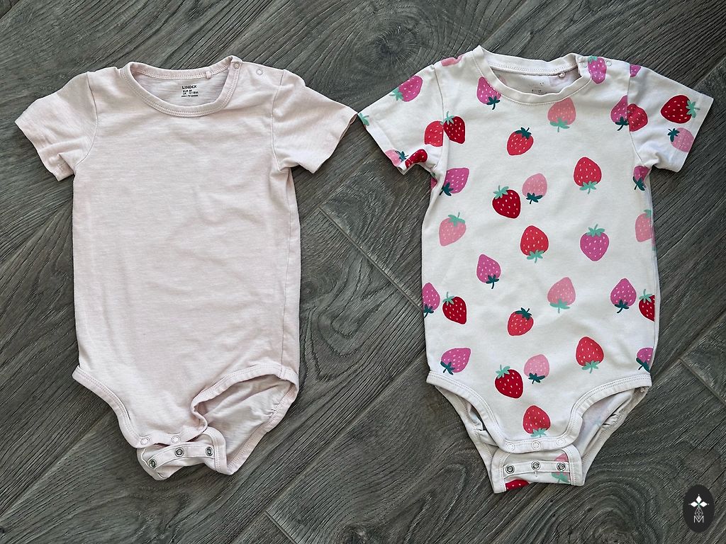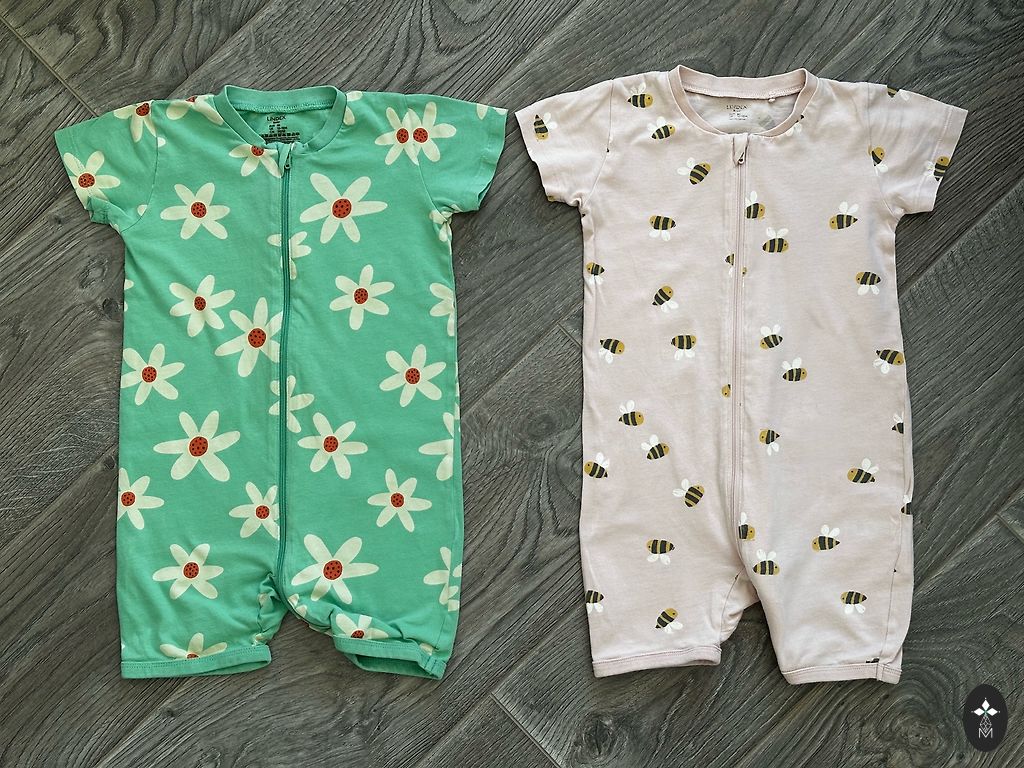 2) dvi trumparankovės pižamos, viena iš jų su aplikacija ant užpakalio;