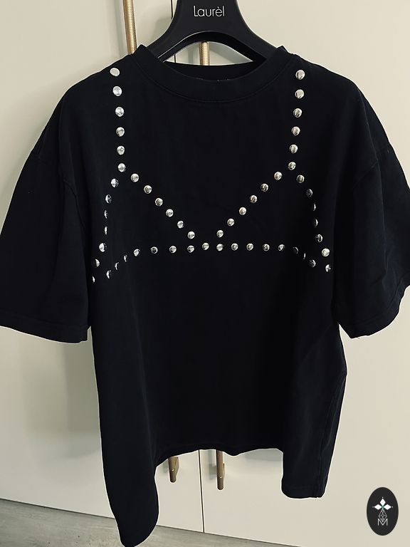 Per didelis megztinis su užrašu priekyje ir gale.