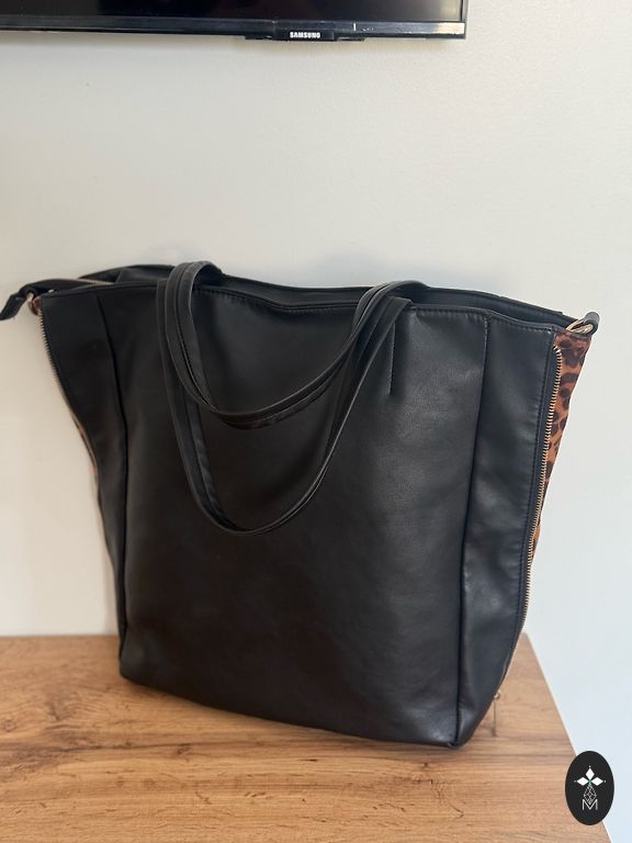 Leopard print sweater and leggings. The leggings have buttons on the sides to adjust the width at the hips.
