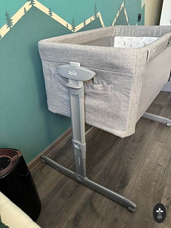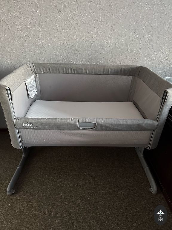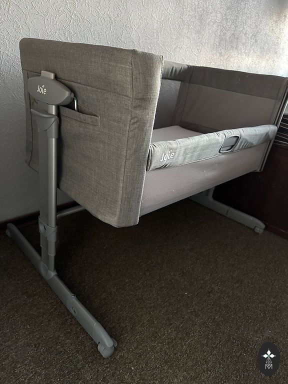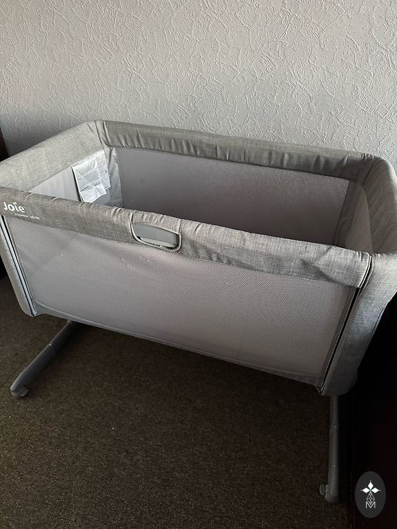 Малоиспользованная кроватка/манеж, без дефектов (царапин от кошки нет). Дорожная кроватка, которую можно разместить рядом и прикрепить к родительской кровати - опускающаяся боковая стенка. Съемный матрас, чтобы можно было спать или играть. Два встроенных колеса. Боковые стенки из сетчатой