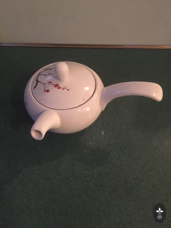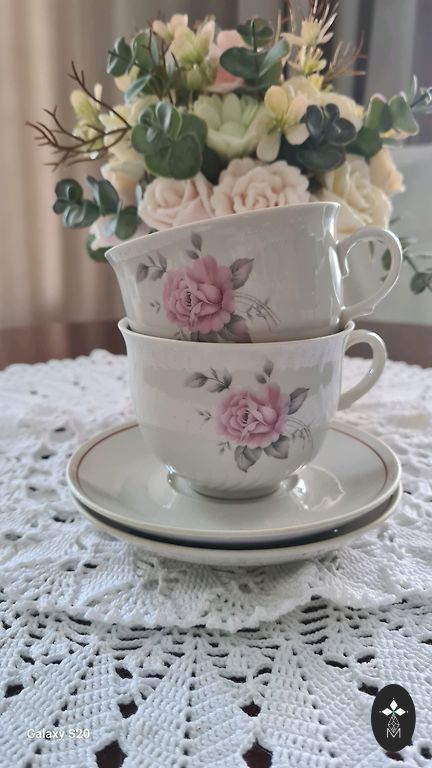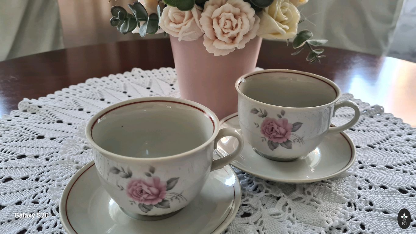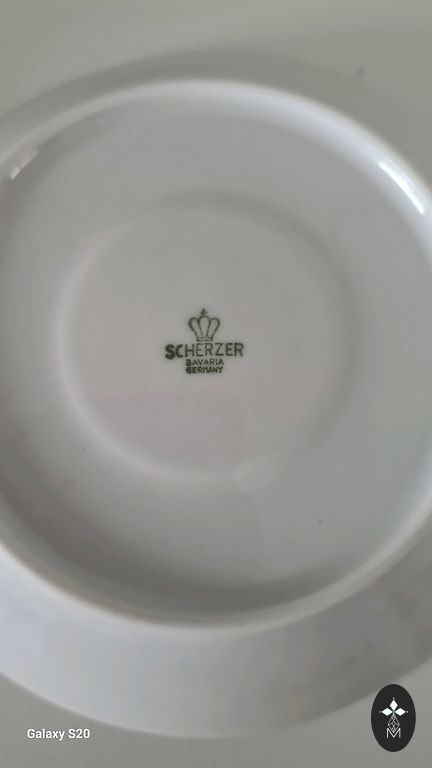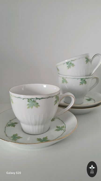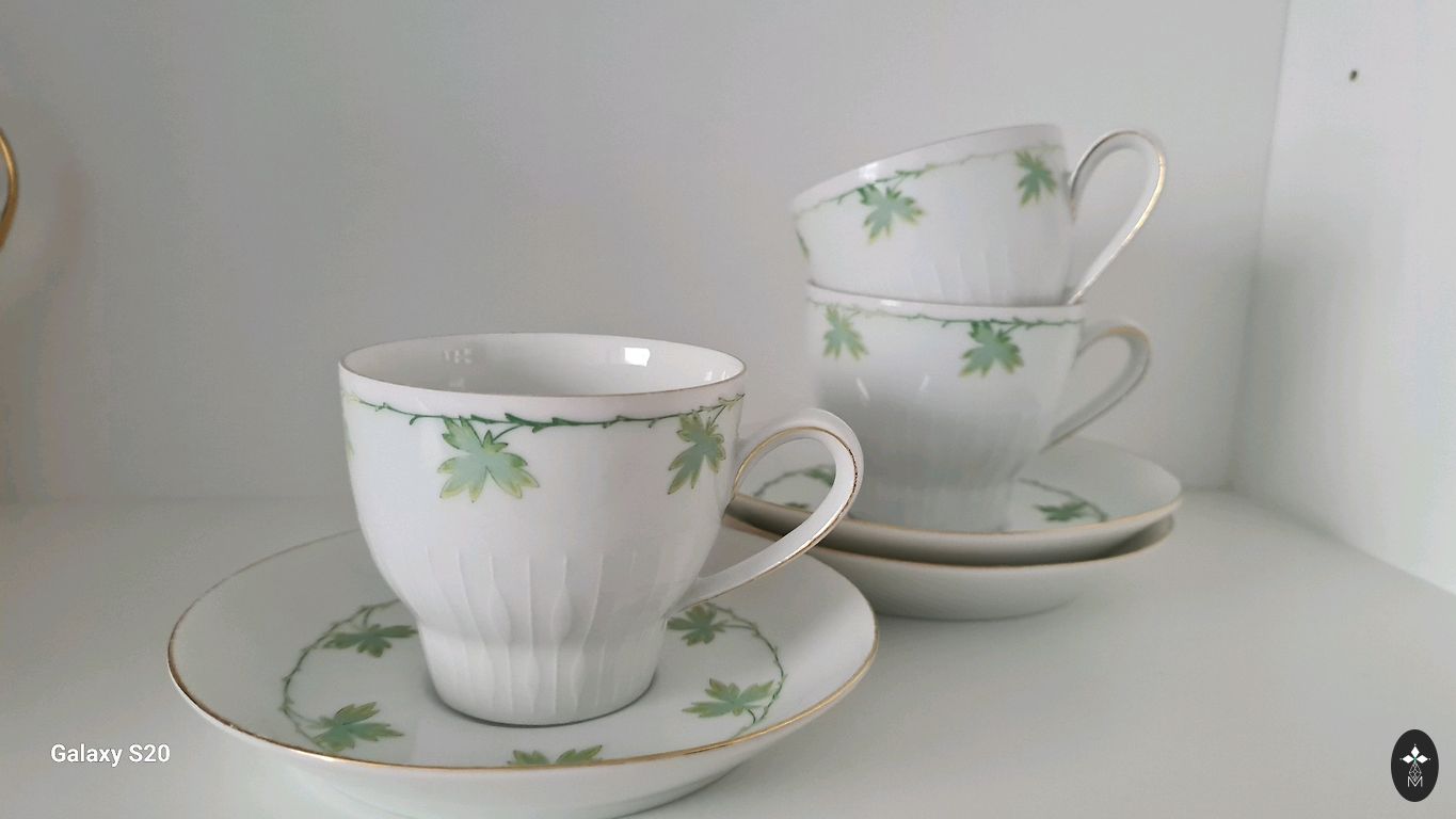 Teekann (kohvikann), suur koogitaldrik (alus), koorekann, suhkrutoos, 8 teetassi, 8 kohvitassi, 8 alustassi, 8 magustoidutaldrikut. Seisukord ideaalne, hoitud puhvetis.