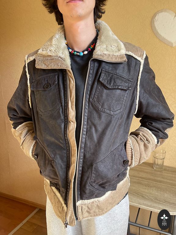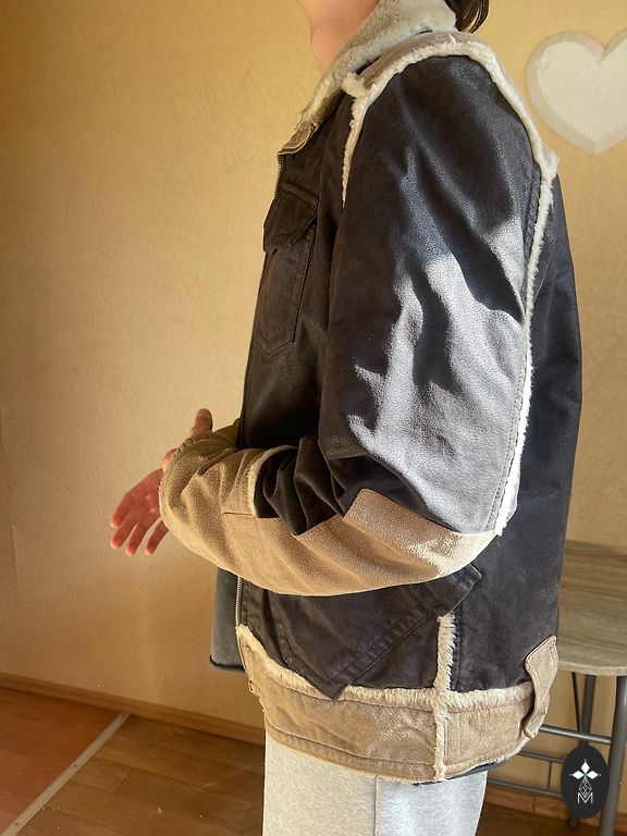 dėmelė ant rankovės (matoma paskutiniame artimo plano nuotraukoje). Rankovės lankstymo zonoje nedidelis natūralus tono pokytis, būdingas natūraliai odai. Apykaklės vilnai yra lengvos tono niuansų pokyčiai, kurie taip pat būdingi natūraliai avies vilnai.