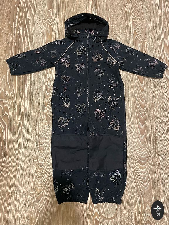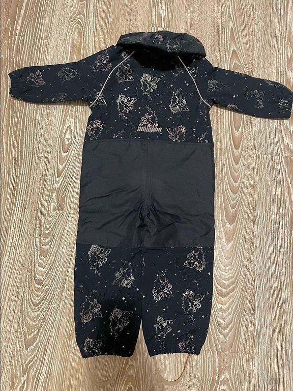 В местах швов местами краска стерта, маленькая дырочка у внутреннего шва ноги, капюшон потерян, резинок нет, но если найду, добавлю, общая длина 85 см, указано 92 см, идеально б/у