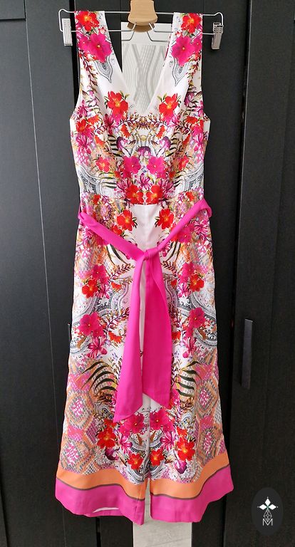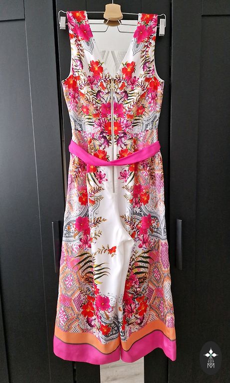 Длина 130 см, талия 84 см, грудь 90 см, бедра примерно 100 см, ширина внизу 23 см (это не окружность). Есть карманы. Плетеный пояс на модели не продается. В комплекте идет тканевый пояс, который сфотографирован на самом комбинезоне.