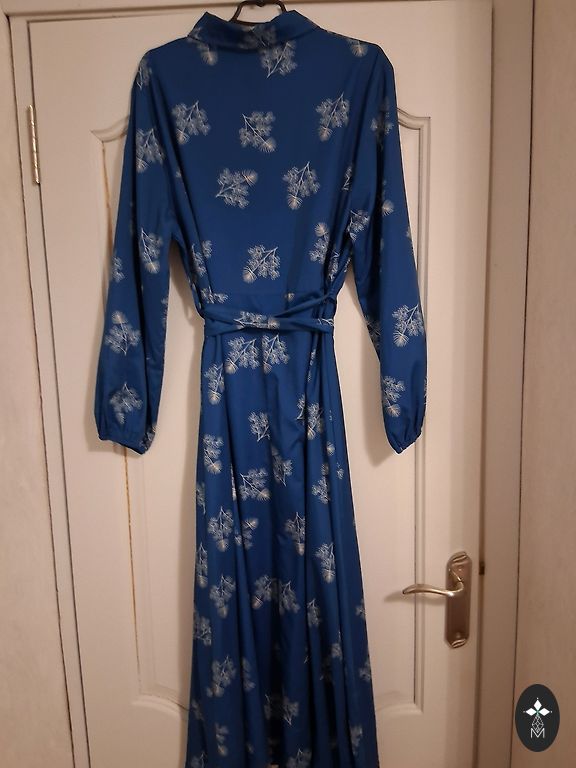 Ilus tumesinist värvi kleit mustriga. V-kaelusega. Vaba ülemine ja alumine osa, keskel on kumm. Vabad käed kerge kummiga otstes. Mõlemal küljel väike lõhik. Vähekasutatud, defektideta. Suurus 38. Mõõdud: pikkus 126 cm, rind 52 cm, varrukas 45 cm, talje venib 38-48 cm, puusad 60 cm. Sobib minu arvates ka suurusele 40.