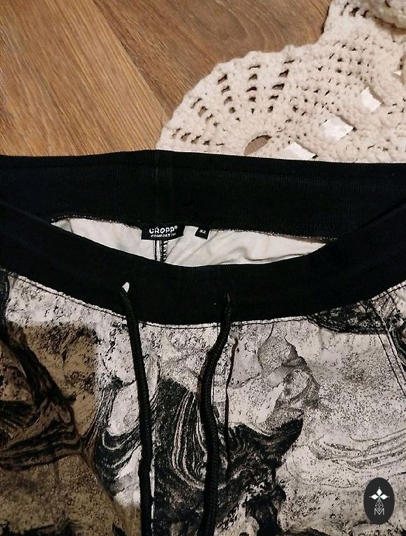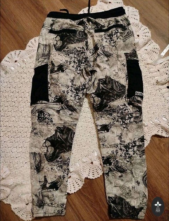 Izmērs 34" 32", melnās viduklī mazliet platākas, jo ir gumija. Vienīgais trūkums- melnajām jāatšuj gali.