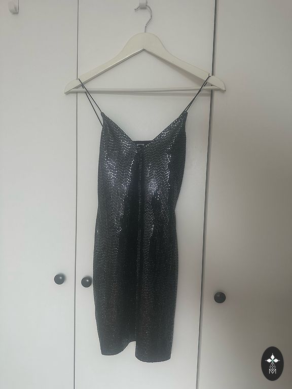 Black cocktail dress with a tulle top. The material is jersey-like with elastane.