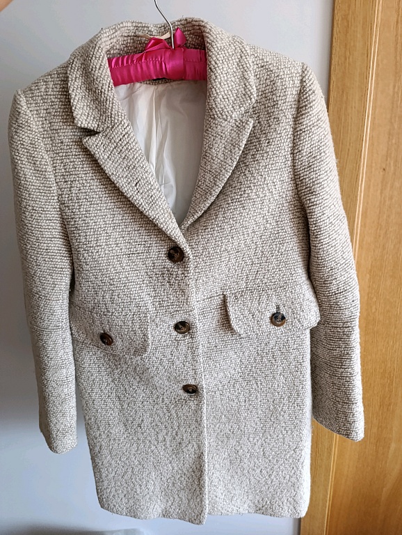 Цвет как на первом фото. Винтажное, шерстяное пальто. Висело несколько лет в шкафу,появились пятнышки,нужна чистка. Всё остальное в порядке.
