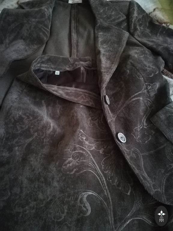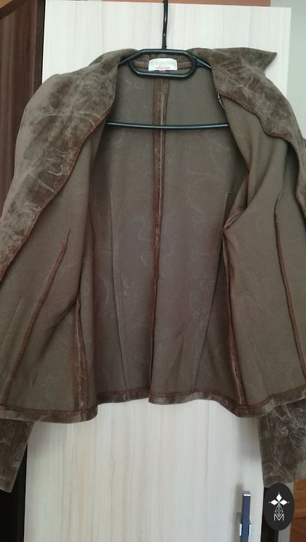 Mazlietota virsjaka pavasarim/rudenim ar siltinātu/stepētu oderi. Mīksts, samtam līdzīgs audums. Īstā krāsa pēdējās divās bildēs. Taisns siluets. Rāvējslēdža aizdare. Oderi un kapuci ar rāvējslēdzi var noņemt, un jaku var vilkt siltākā laikā kā lietusmēteli. Plecos nelieli polsterīši. Piedurkņu garums regulējams ar atloku. Derēs arī XL izmēram, būs brīvāka. Bez defektiem. Mēri: garums 82 cm, platums plecos 45 cm, apkārtmērs zem padusēm un viduklī 58x2 cm, gurnos 61x2 cm, piedurknes neatlocītā veidā 69 cm, max atlocītas 60 cm.