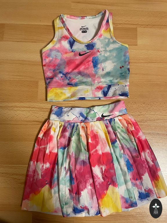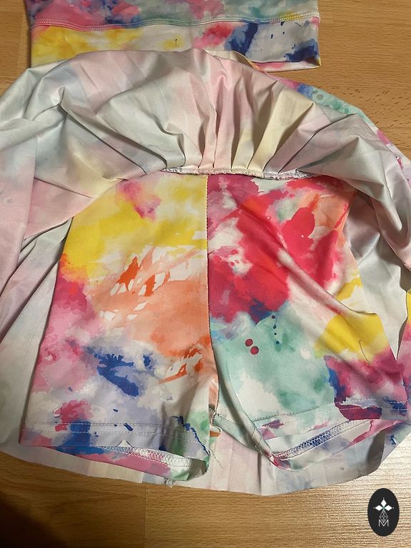 Ilma kasutusjälgedeta, lühike topp ja seelik/püksid.