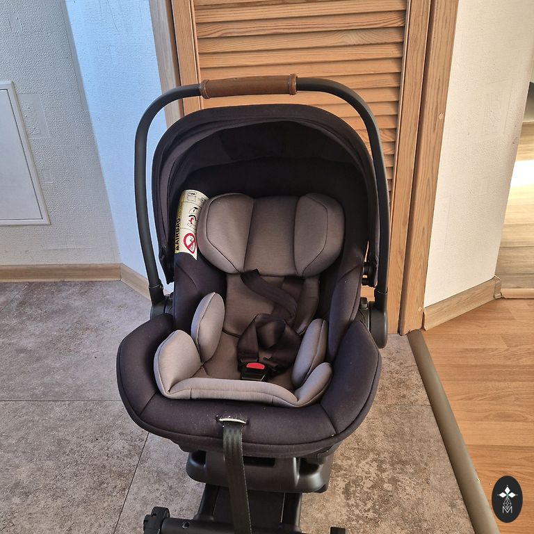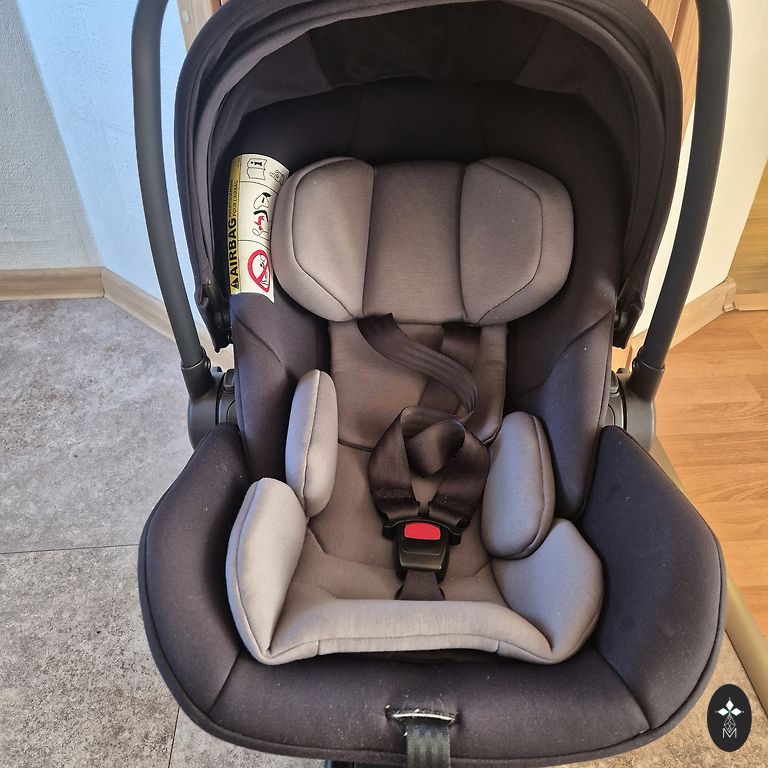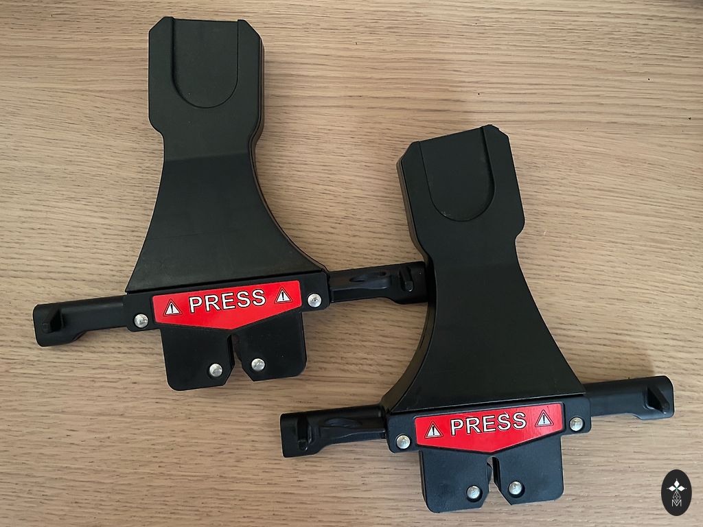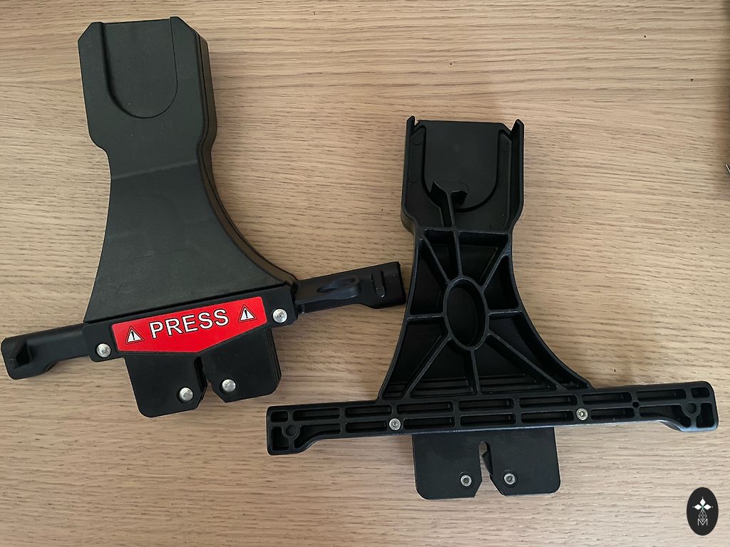 Yra įbrėžimų ant plastikinių detalių. Ir lipduko kraštai atsilupę. Taip pat galima įsigyti adapterius Emmaljungos vežimėliams už 25€.
