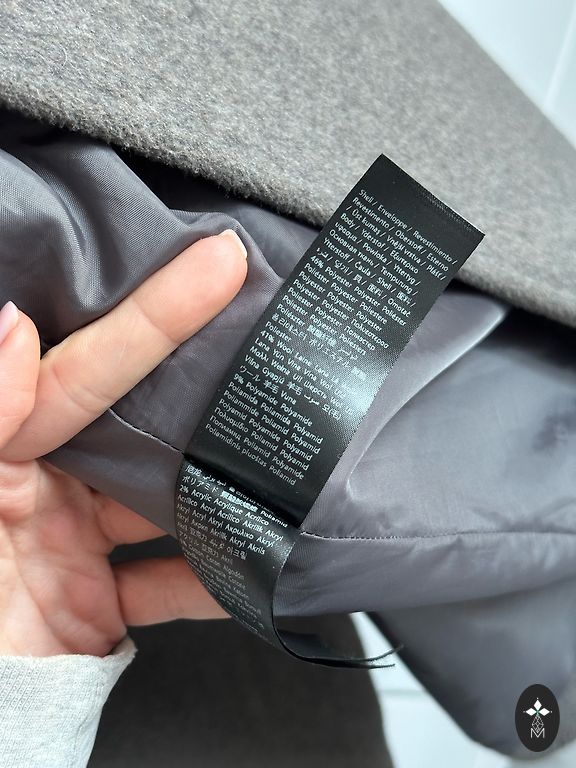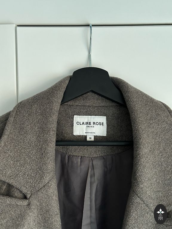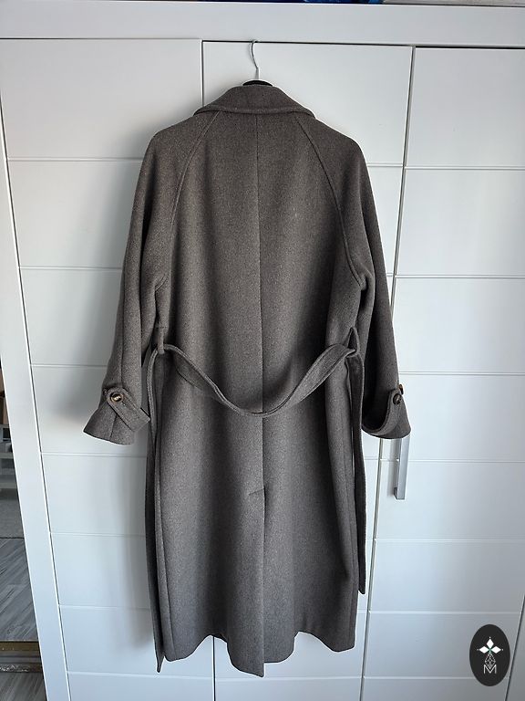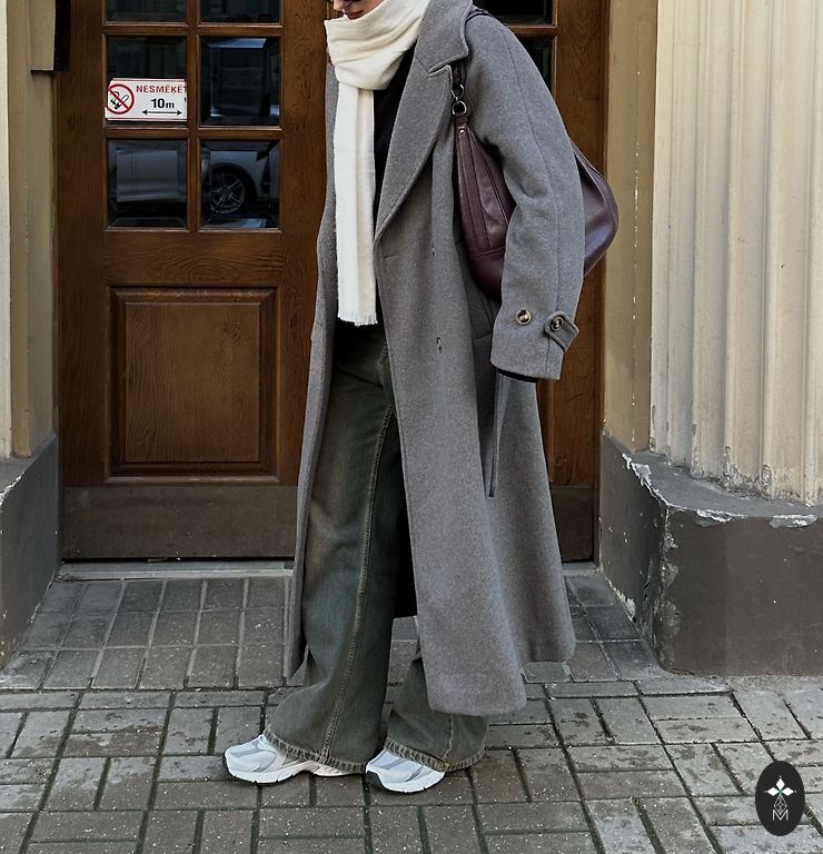 Puikus ilgis, ilgos rankovės, dvipusis diržas (aksomo/vilnos audinio). Tiesus kirpimas.