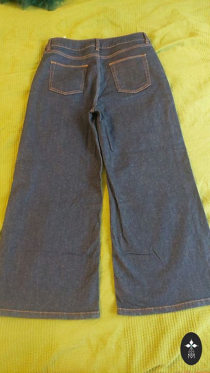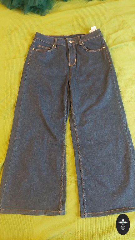 Ilusad sinised teksad peenikese kehaehitusega naisele, märgitud suurus 36, sirge lõige.