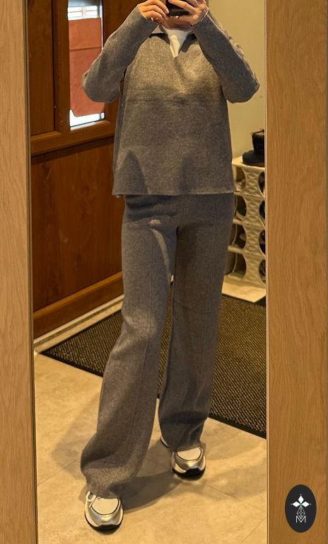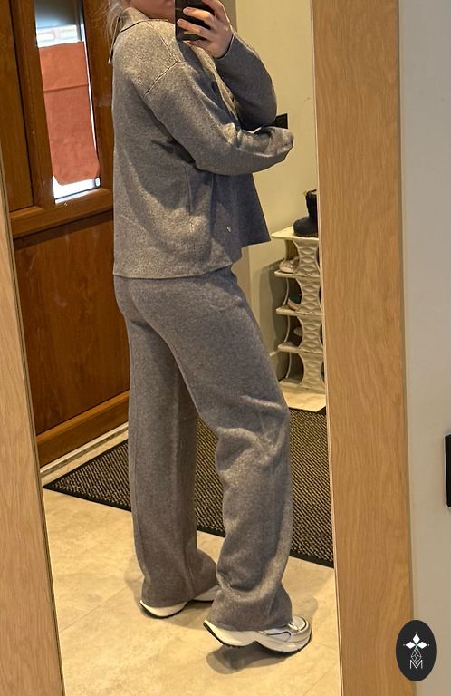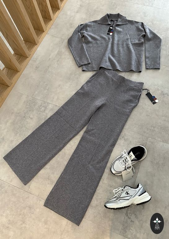 Saīsināta veste ar akcentētiem pleciem un platas bikses ar augsto jostasvietu. Lieliski izskatās ar blūzi vai kreklu.