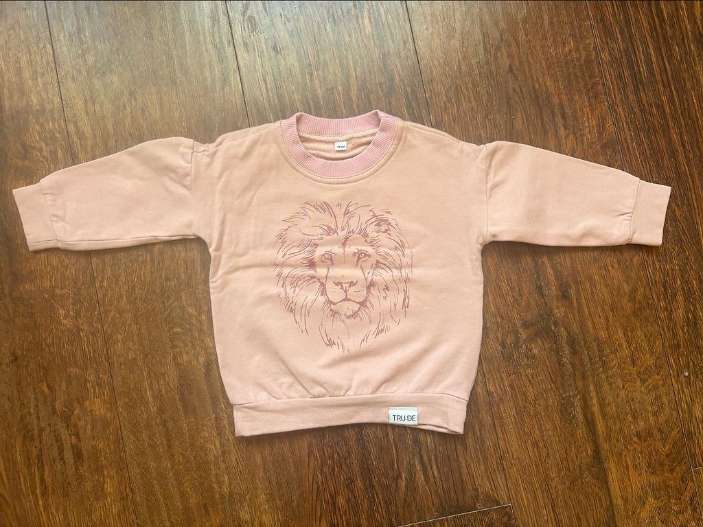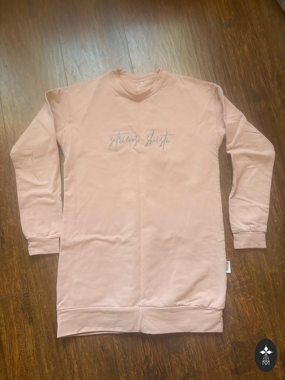 Tru:de megztinis su mielu užrašu ir moteriškais raukiniais ant pečių.