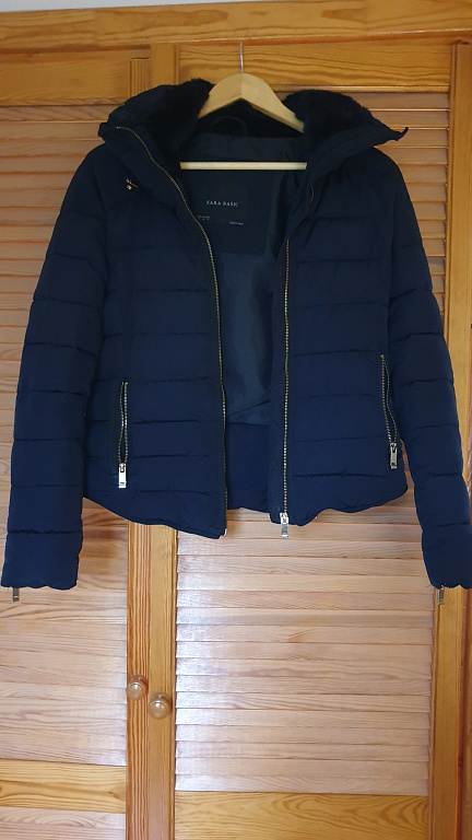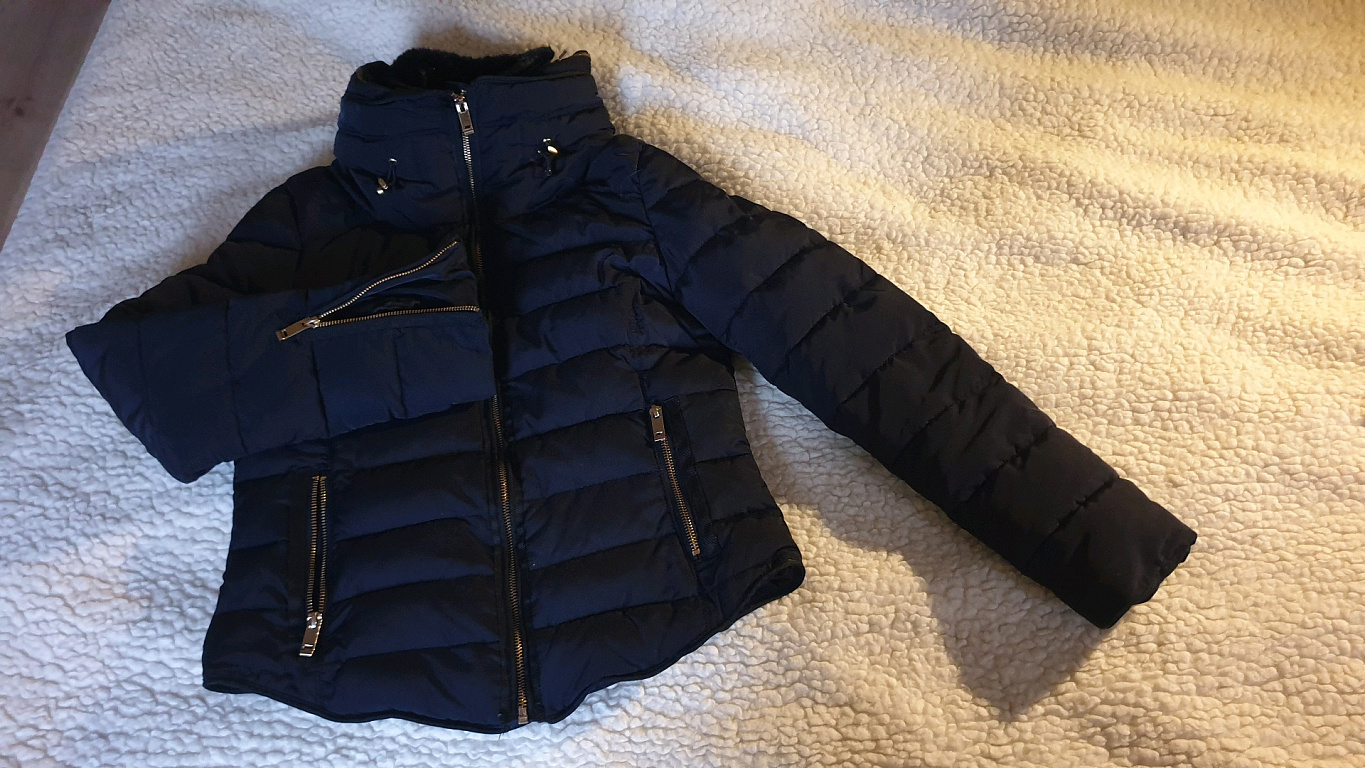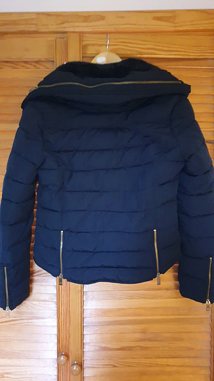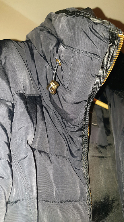 Pikkus - 100 cm, rindkeres (kaenla alt kaenla alla) 61 cm, varruka pikkus 67 cm. Kinnitus - tõmblukk ja trukid. Varrukal lisaks kootud mansetid kätele, kapuuts (ei ole eemaldatav), eemaldatav karusnahk kapuutsi ümber. Uus, kasutamata, puuduvad defektid.
