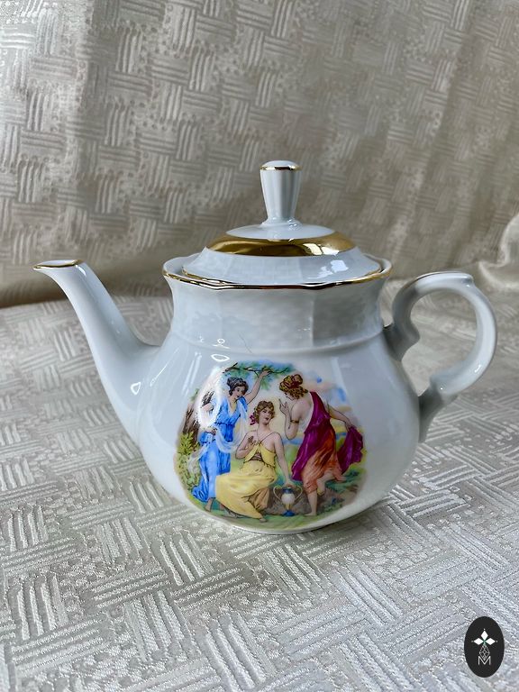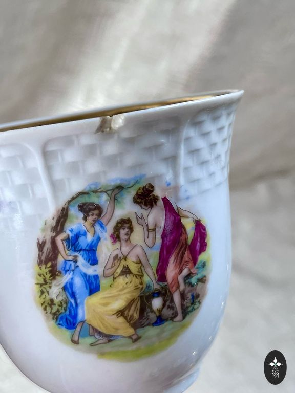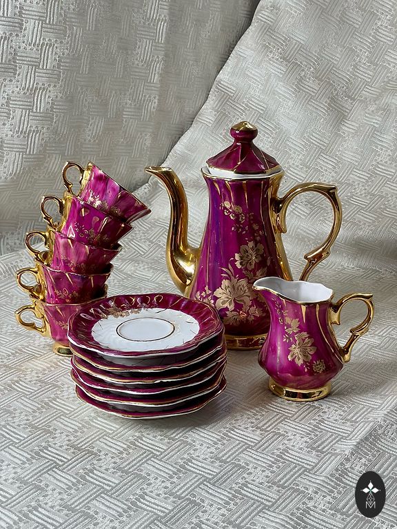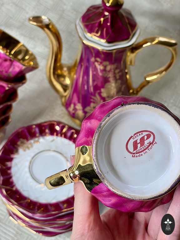 💚Graži vintage porceliano arbatos servizė su subtiliu įvairiaspalviu gėlių raštu ir elegantišku aukso apvadu.