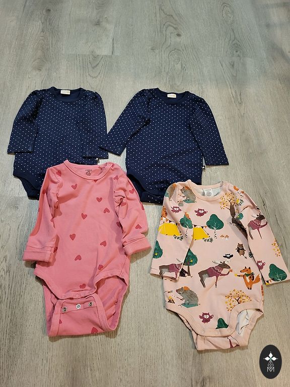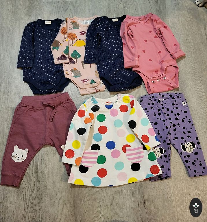Komplektid, džemprid, püksid, väga palju bodisid (pikkade ja lühikeste varrukatega). On mõni plekk, auke ei ole!!! Ja palju sokke!