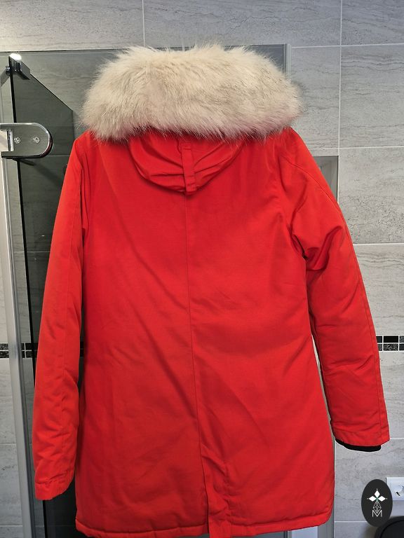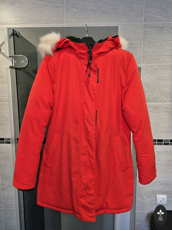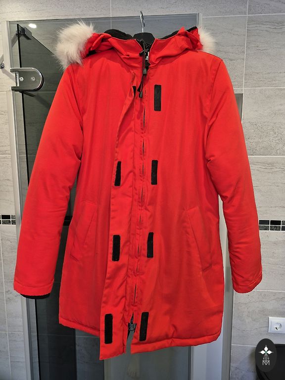 Soe lukuga jakk, taskud, vöökohas pingutatav pael. Kapuuts karvasega, saab eemaldada. Rinnaümbermõõt 106 cm, pikkus 81 cm, varruka pikkus 65 cm.