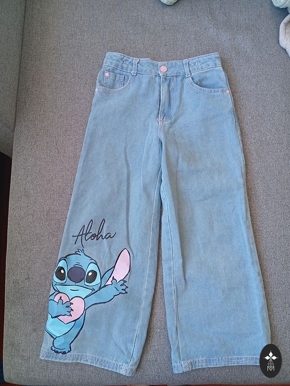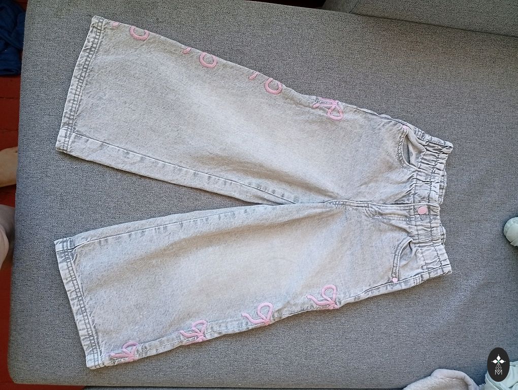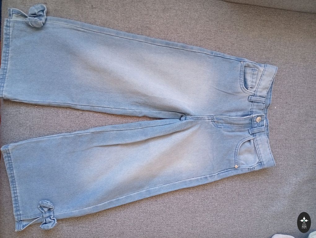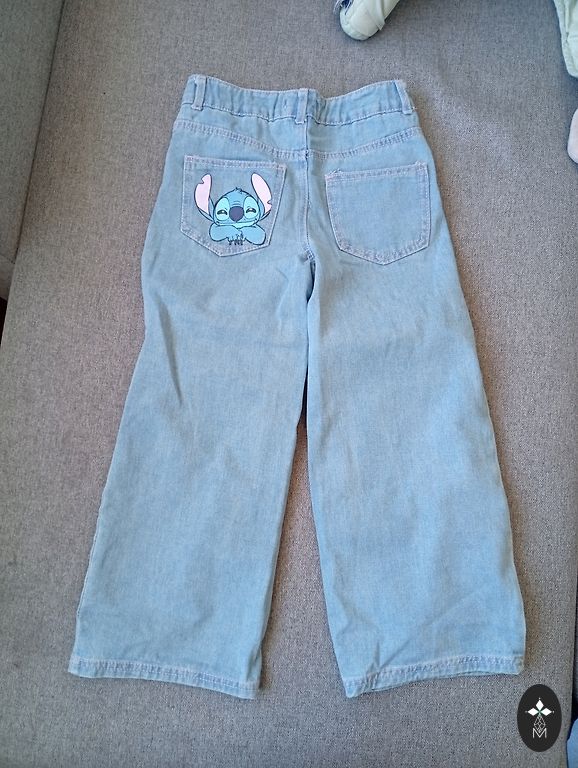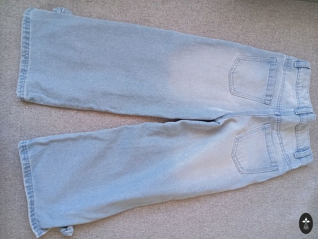 Lahedad teksapüksid rebenemisega. Väga stiilsed väikesele daamile. Väike plekk põlvel, muidu ilma defektideta.