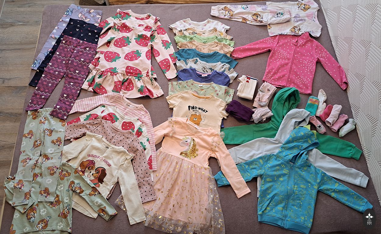 Various clothes for a girl, mostly size 80. Various brands, such as H&M, Lindex, Pepco, Billieblush, M&S, F&F. Mostly dresses and pinafores, some shirts and bodysuits, a spring jacket and hats. Reserved winter jumpsuit. Swimsuit and beach slippers. Clothes in good or excellent condition.