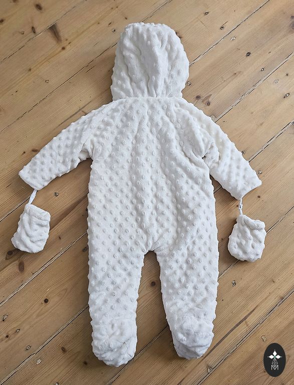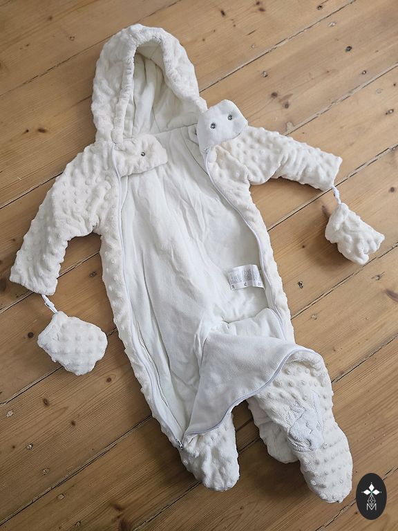 Puikiai tinka važiuojant automobiliu ar pasivaikščiojimams su vežimėliu, 68 dydis, labai geros būklės, be defektų. Idealu, kad galima atlenkti ir užlenkti rankoves bei kelnių klešnes, todėl galima dėvėti ilgiau.