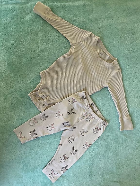 Kaks ilus body ja retuusid. Bodyde suurus - 68, retuuside - 74. Kandsime kõik korraga. Võimalik, et kuskil on mõni väike plekk.